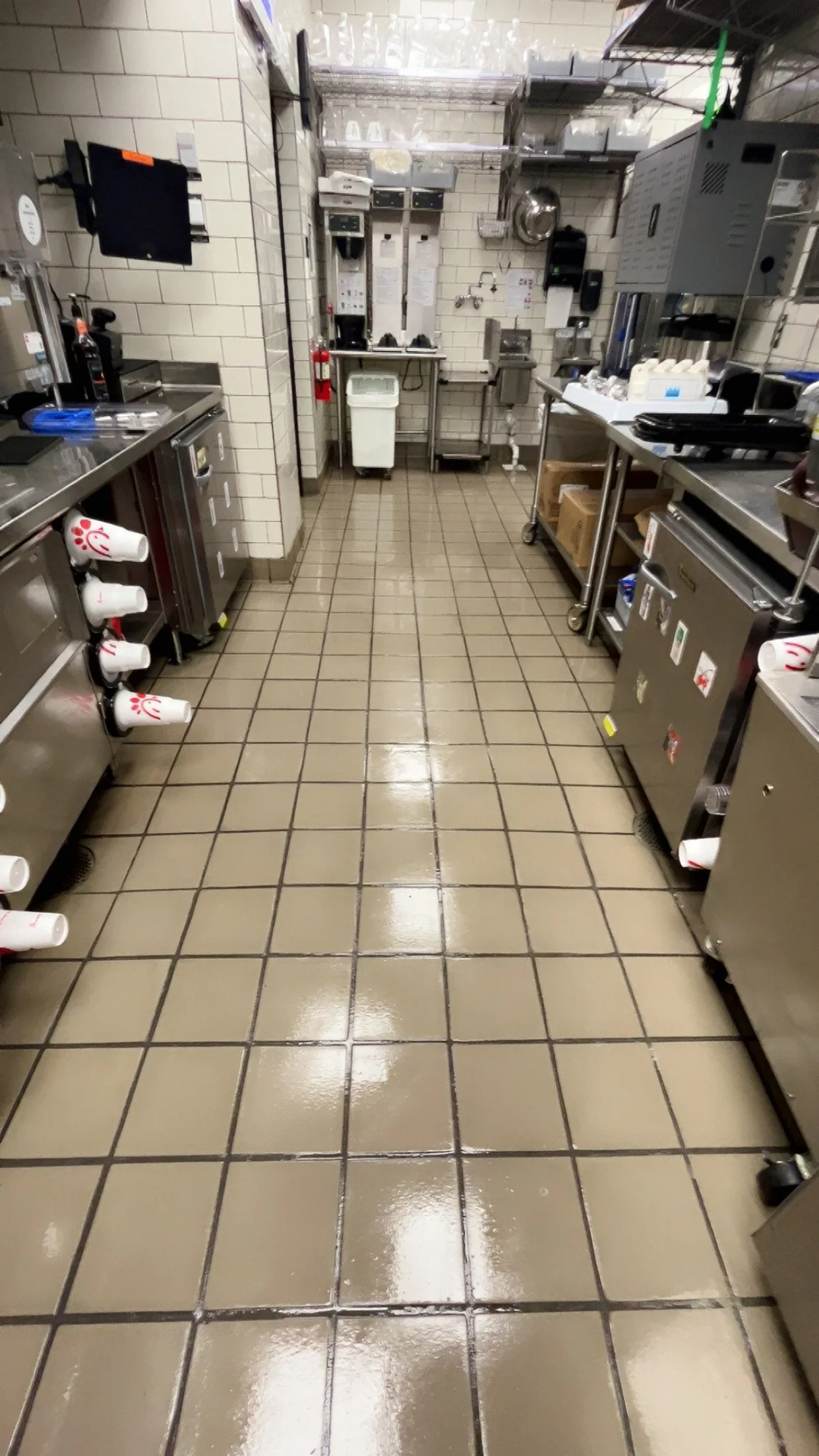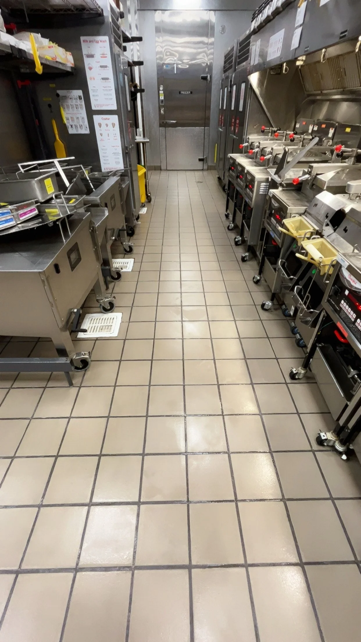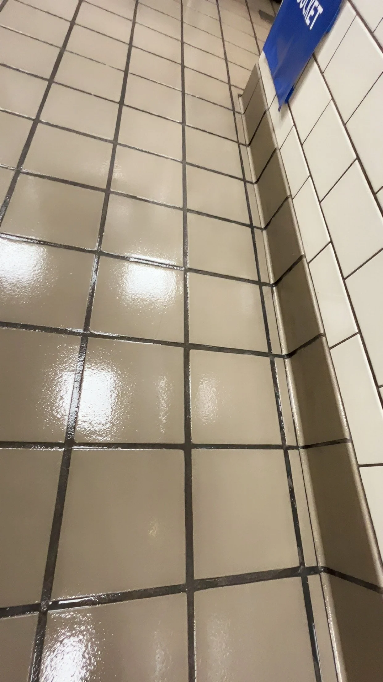 Close-up of beige tiled floor and wall with dark grout lines in a building, possibly a fast food restaurant or similar establishment.