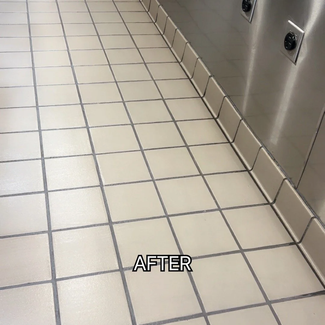 Clean tiled floor next to a stainless steel locker, labeled 'AFTER'.