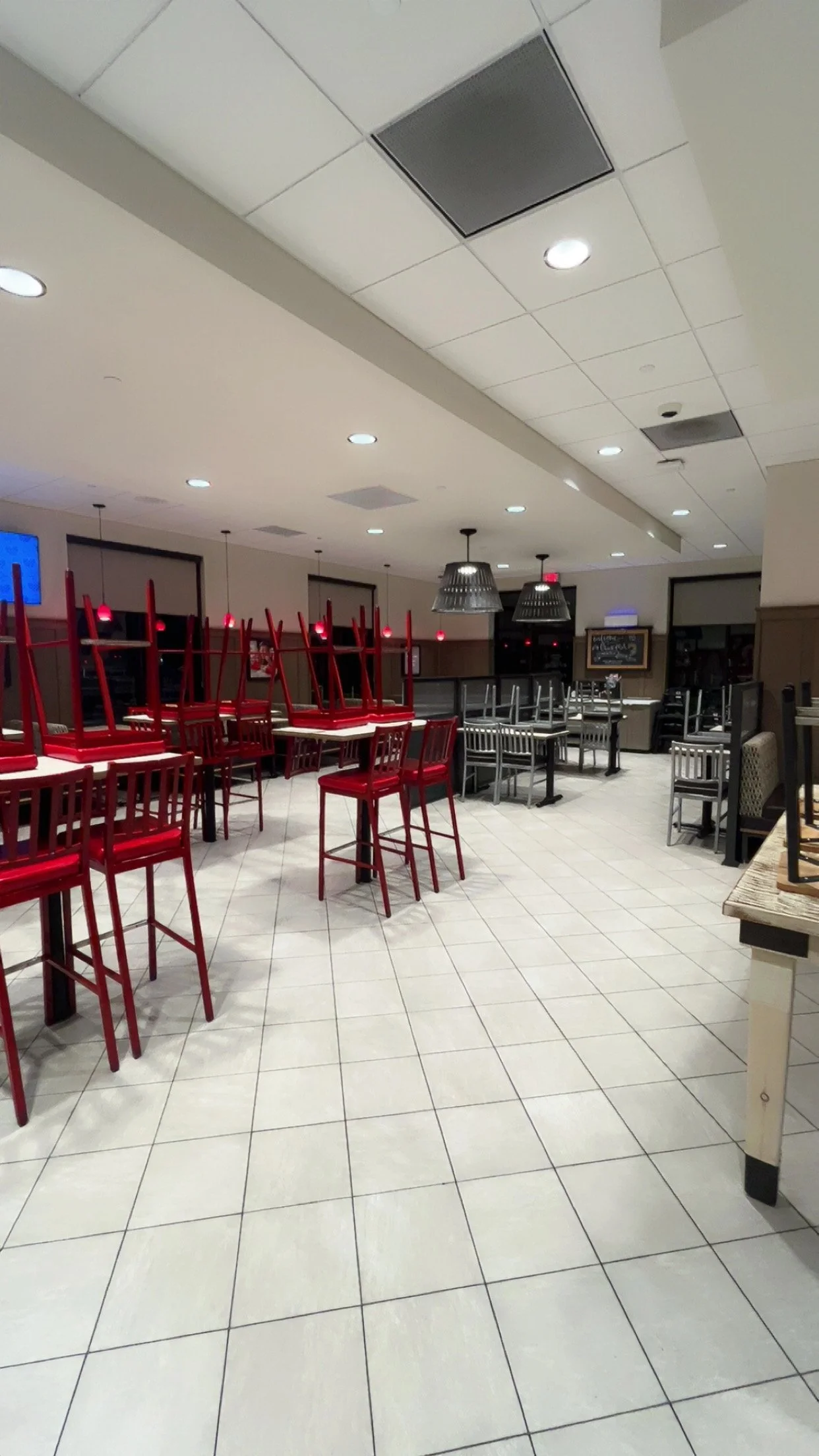 Empty restaurant with chairs stacked on tables and overturned chairs on the floor, indicating it is closed or not in service.