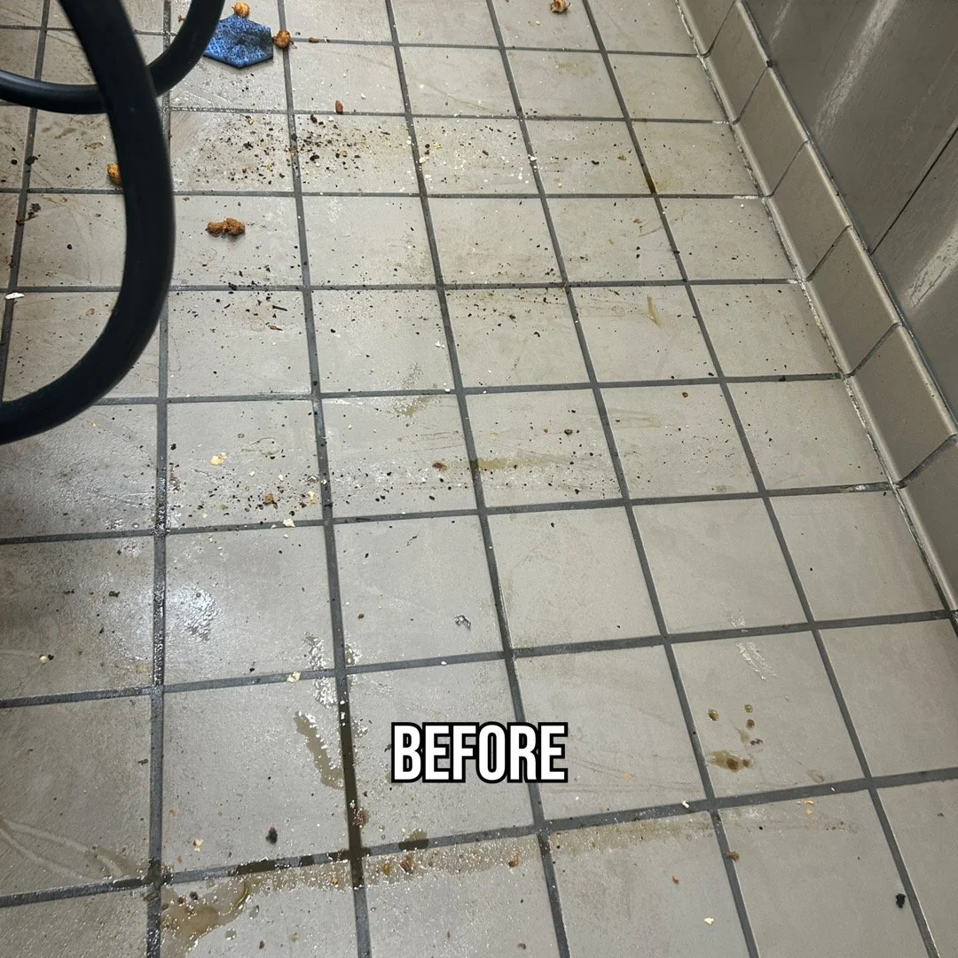 Dirty tiled floor in a public restroom with scattered debris, dirt, and liquid stains. The word 'BEFORE' is written at the bottom of the image.